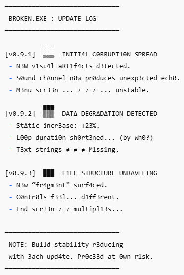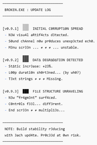 This is version 0.9/1.0—unstable by design. With each weekly update, the glitch spreads, new distortions appear, and the line between “game” and “broken software” blurs even further.