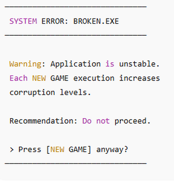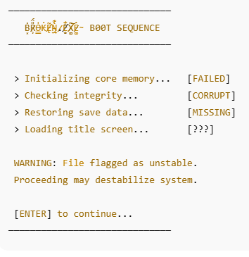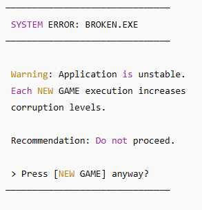 Broken: Son of a Glitch is not here to entertain you—it’s here to unravel you. Each time you press New Game, the program resists, splinters, and rewrites itself in front of you. The rules dissolve, the screen shifts, and what you thought was a game slips further away.